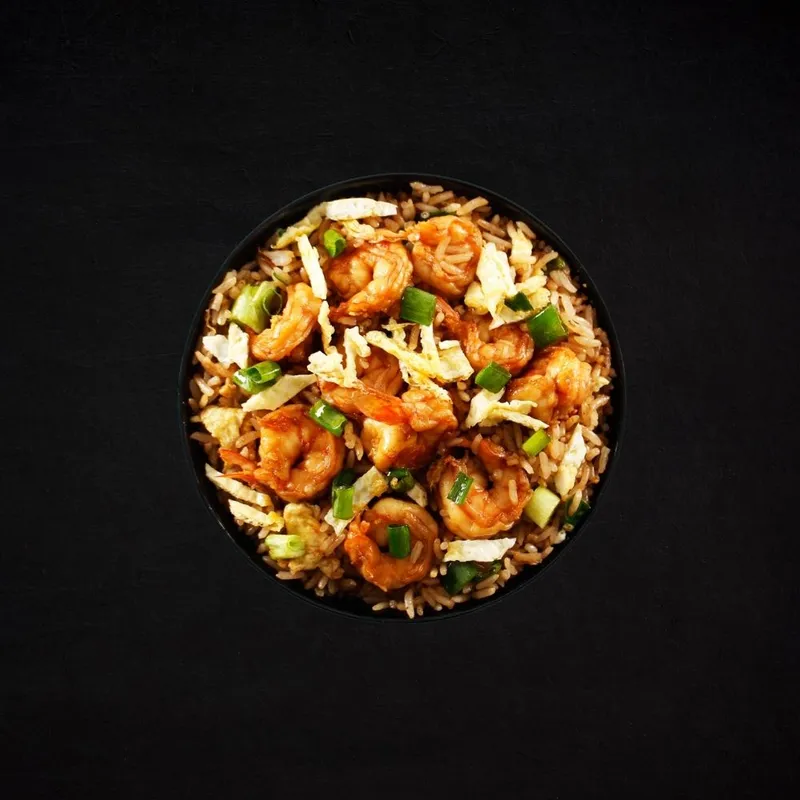 Arroz frito con trozos de pechuga de pollo, huevo, fideo tallarín, frejol chino, huevo y cebolla china.