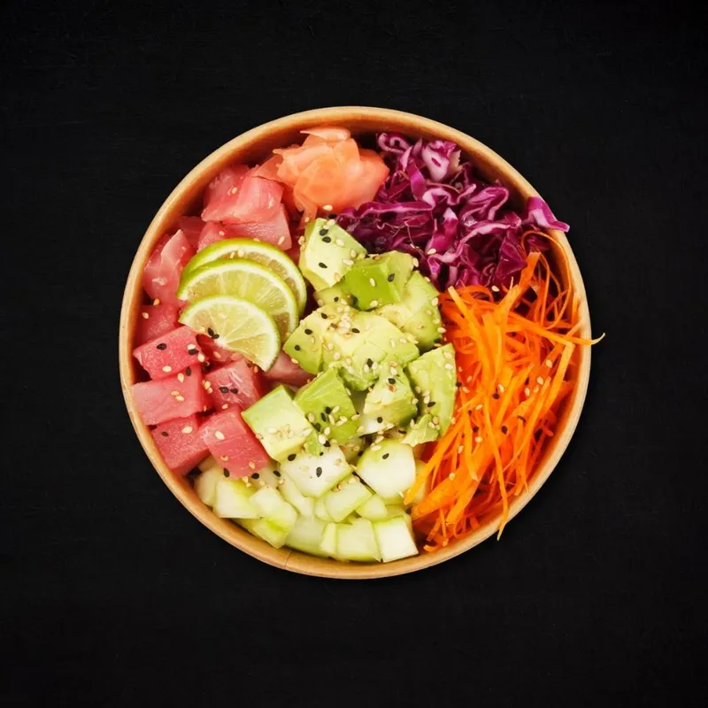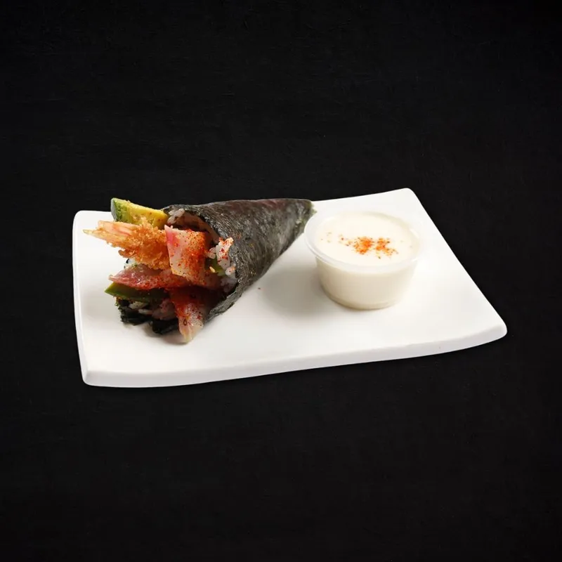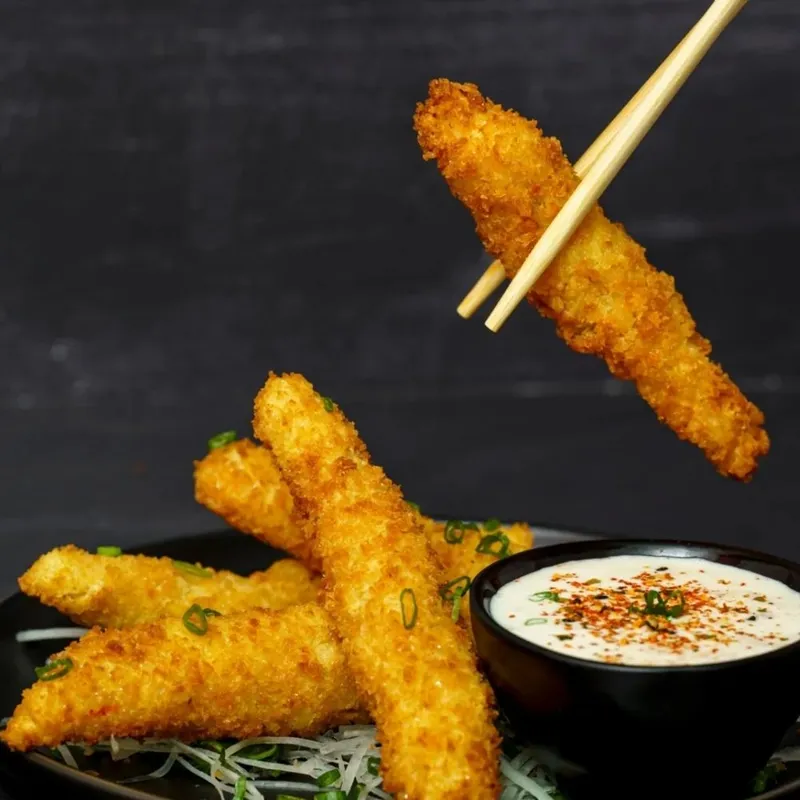 Sándwich frito relleno de tartar de pescado y langostinos en abundante salsa acevichada, arroz de sushi y un toque de shichimi togarashi.